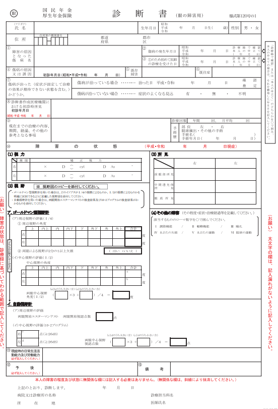 障害年金の申請では、「診断書」が最も重要な書類のひとつです。眼の障害の場合には、様式第120号の3(眼の障害用)という専用の診断書様式を用います。